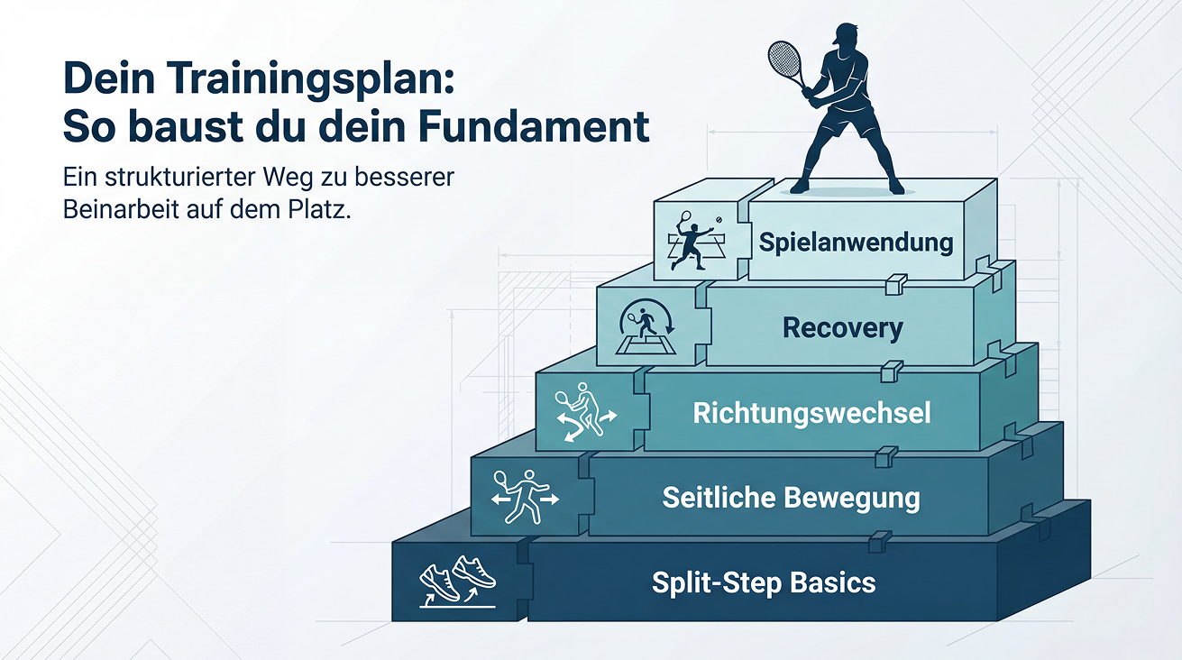 Gute Beinarbeit entsteht nicht über Nacht. Aber sie entsteht auch nicht durch Zufall. Dieser Plan zeigt dir genau, in welcher Reihenfolge du was lernst – vom Split-Step bis zur Spielanwendung. Jede Stufe macht dich sicherer. Und nach 4 Wochen steht dein Fundament.